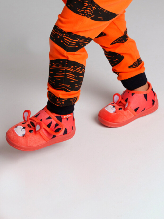 Верх тапочек выполнен из изностойкого текстиля с мягкой, приятной на ощупь поверхностью. Подкладка и стелька из трикотажа с высоким содержанием хлопка 95%.Противоскользящая подошва с защитой задней части. Конструкция с широкой липучкой позволяет легко обувать тапочки на малышей.