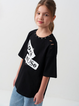 Футболка оверсайз для девочки подростка. Модель выполнена из эластичного хлопкового трикотажа джерси. Принты в рок-стилистике. На передней части расположена надпись "rock muse" с графикой, имитирующей булавки. На спинке — логотип. Горловина украшена принтом с белыми звёздами. Дополнительные элементы дизайна — декоративные разрывы на плече, металлическая нашивка внизу и боковая лента с логотипом бренда.