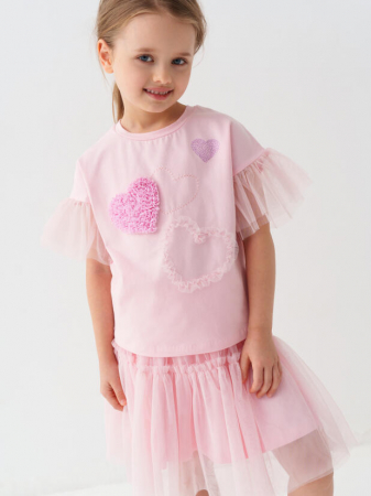 Детская футболка для девочки. Модель прямого кроя, выполнена из эластичного хлопкового трикотажа джерси. Спереди расположен крупный принт с сердечками. Горловина круглая. Рукава-крылышки из сетки.