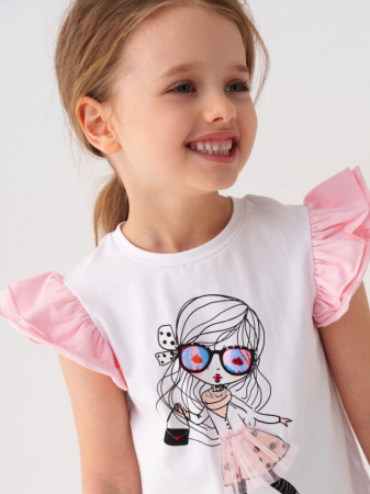 Детский костюм для девочки. Состоит из футболки с коротким рукавом и шорт. Выполнен из хлопкового трикотажа. Футболка прямого кроя, с рукавами-крылышками и красочным принтом. Шорты свободные, хорошо сидят на талии благодаря эластичному поясу и регулирующему шнурку.