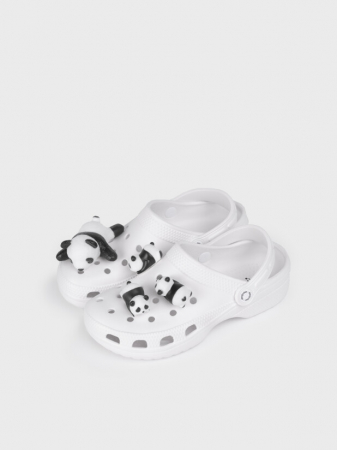Трендовые сабо для девочки подростка в черно-белой гамме с джибицами-пандами. Шлепанцы выполнены из облегченного и прочного ЭВА. Материал хорошо моется. Форма модели учитывает эргономику стопы. Модель имеет перекидной ремешок для лучшей фиксации обуви на ноге.