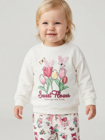 Детский свитшот для девочки. Выполнен из хлопкового футера без начеса. На передней части — нежный принт с тюльпанами и бабочками. На плече застежка на кнопки для удобного переодевания. Низ изделия и рукава оформлены эластичными резинками.
