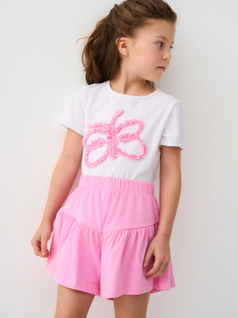 Детский костюм для девочки. Состоит из футболки с коротким рукавом и шорт. Выполнен из хлопкового трикотажа. Футболка прямого кроя, с красочным принтом бабочки. Шорты свободные, хорошо сидят на талии благодаря эластичному поясу.