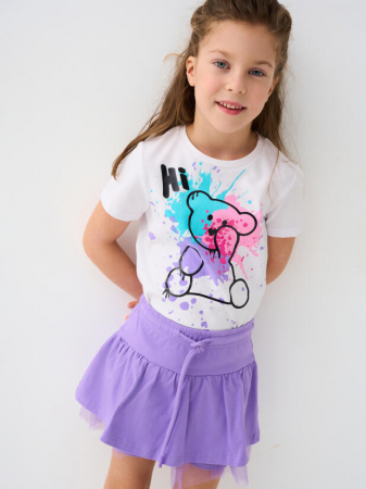 Легкий детский комплект для девочки. Выполнен из мягкого хлопкового трикотажа джерси, состоящий из футболки и юбки-шорт. Футболка прямого кроя с ярким принтом с мишкой. Пышная юбка на резинке со шнурком, украшена воланами и сеткой, внутри имеет удобные шорты, что делает модель практичной для активного отдыха.