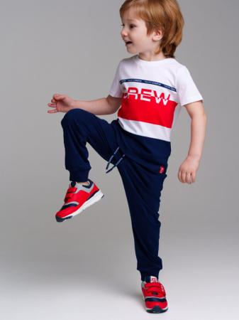 Комплект: футболка, брюки из качественного и приятного на ощупь трикотажа джерси. Высокое содержание хлопка 95%. Благодаря наличию эластана в составе ткани изделие проще в уходе и держит форму. Regular fit. Эластичный пояс со шнурком. Карманы. Манжеты брюк в эластичный рубчик.