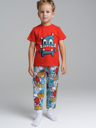 Пижама: футболка и брюки из эластичного и приятного на ощупь трикотажа. На брюках эластичный пояс со шнурком. Высокое содержание хлопка 95%. Благодаря наличию эластана в составе ткани изделие держит форму и меньше мнется.