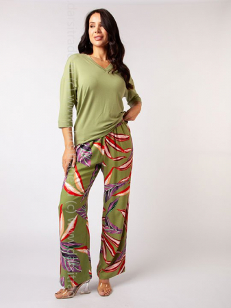 Комплект домашней одежды. Футболка трикотажная, V образный вырез, рукав 3/4, свободного кроя. Брюки выполнены вискоза твил, с высокой талией, на мягкой резинке, вточные карманы.
