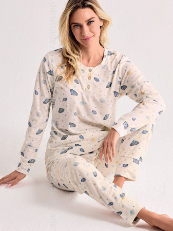 Пижама: кофта с длинным рукавом и брюки на манжетах. Застежка - три пуговицы на планке. Выполнена из флиса.