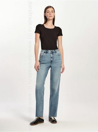 Джинсы straight комфортной посадки. Необработанный край, эффект потертостей, контрастная строчка. Застёжка на металлическую пуговицу и молнию, скрытую планкой. Модель с пятью функциональными карманами, оригинальная задняя шлёвка, фурнитура цвета антик. Выполнена из денима премиального качества