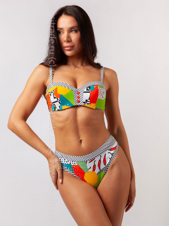 Лиф бандо на каркасе, из тонкого поролона, декольте с контрастным кантом , регулируемые съемные бретели и металлическая застежка на спине. Плавки - слипы средней посадки с контрастным кантом.