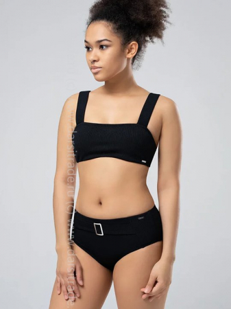 Купальник: лиф + трусы из оригинальной ткани «в рубчик». Купальник имеет подкладку по всему объему. В лифе – встроенные съемные формованные чашечки. По краям – силиконовое напыление для уверенной фиксации на теле. Лиф типа «бандо», на широких бретелях и трусики с поясом и пряжкой.