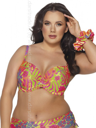 Бюстгальтер пляжный в цвете флуоресцентный выполнен с шитыми чашками на тонком поролоне, на косточках, бретели регулируются по длине, на спине металлическая застёжка в виде ракушки цвета меди. Бюстгальтер впечатляет своим необычным неоновым принтом, благодаря которому не нуждается в дополнительных украшениях.