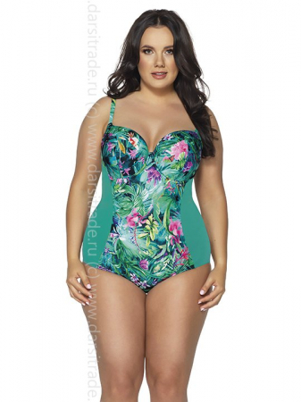 Совместный купальник SKJ52 из тканей-компаньонов. Лиф купальника на косточках, на тонком поролоне, с внутренней стороны купальник продублирован сеткой, под грудью пришита широкая резинка, на спине металлическая застёжка в виде ракушки. Тонкие бретели регулируются по длине. Фурнитура металлическая цвета меди. Встроенная в костюм надежная конструкция бюстгальтера с полной чашкой удобно стабилизирует бюст, аппетитно подчеркивая его в области декольте. Равномерные зеленые бока сделают талию стройнее, экзотический красочный принт поражает буйством красок и подчеркивает достоинства фигуры.
