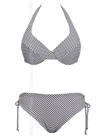 Двусторонний раздельный купальник: бюстгальтер с мягкой чашкой (без вкладышей), на косточках, и трусики-слип, высота бочков регулируетя кулиской на 5-7 см (высокая и средняя посадка). Застежка- завязка на спинке. Возможны разные варианты крепления бретеле
