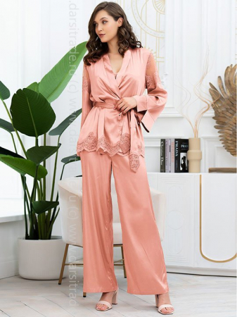 Элегантный комплект Mia-Amore - состоит из жакета с длинным рукавом, широких брюк и кружевного бралетта, выполнен из смесового шелка и дополнен кружевными вставками. Линию талии можно подчеркнуть за счет широкого пояса с кружевными вставками на концах, который идет в комплекте.