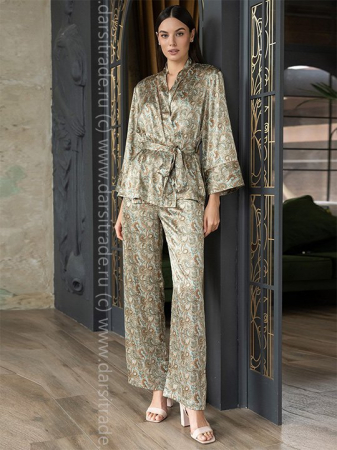 Комплект Mia-Amore состоит из запашного жакета и брюк прямого силуэта, комплект выполнен из принтованного искусственного шелка. Борта жакета, притачные манжеты на рукавах 7/8 декорированы тонким контрастным кантом. В комплекте идет пояс. В боковых швах брюк расположены карманы.