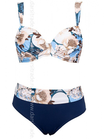 Раздельный купальник: бюстгальтер на косточках с мягкой чашкой, по пройме регулируемая сборка. Бочок усилен костью. Бретель: регулируемая, 2 варианта завязывания. Застежка - поворотный замок. Трусики-слип с отворачивающимся поясом на высоту 10-16 см (сре