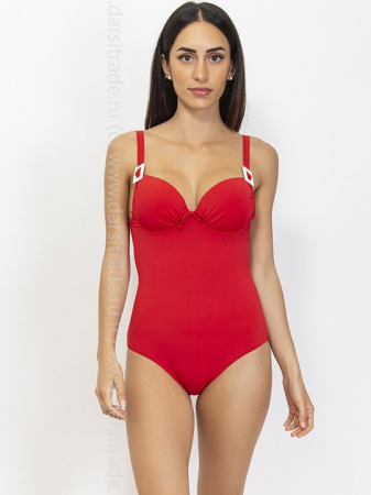 Совместный купальник с формованными чашками (без пуш-ап) на косточках. Передняя часть купальника дублирована укрепленной сеткой обеспечивающей легкий утягивающий эффект и поддержку. Регулируемая бретель.