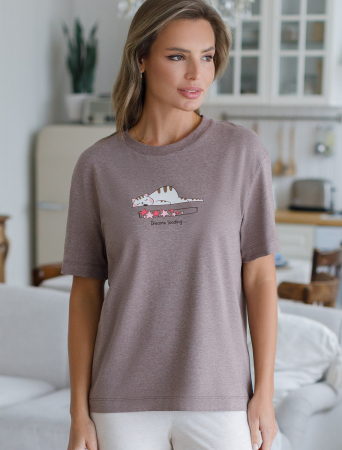 Футболка темно-кофейного цвета с эффектом меланж изготовлена из премиального хлопка с эластаном, она обеспечивает невероятное ощущение уюта и легкости. Натуральный материал сохраняет форму и цвет после множества стирок, обеспечивая долговечность изделия, а его высокая воздухопроницаемость создает ощущение свежести даже в течение долгого дня.