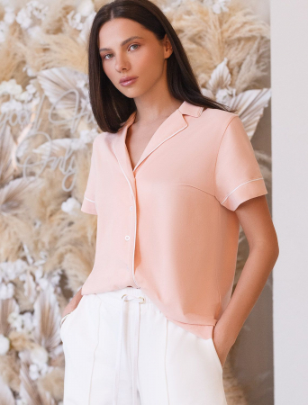 Блузка с английским воротом выполнена из эластичного хлопка. Модель дополнена контрастным кантом. Самые мягкие волокна премиального хлопка гарантируют непревзойденный комфорт в течении всего дня. Эластан в составе изделия, поддерживает форму и препятствует сминаемости. Сочетается в костюме с шортами D48.006 и брюками D44.120