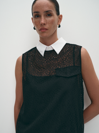 Вечернее платье из полупрозрачного ажурного кружева. Модель длиной до колен, с аккуратным круглым вырезом, декорированным контрастным съемным воротником из белого хлопка. Привлекает внимание декоративный нагрудный клапан , придающий платью деловой вид. В комплекте с изделием идет платье-комбинация на тонких бретелях, плотная ткань не просвечивает и обладает хорошей воздухопроницаемостью. Стильный черный уместен в любой ситуации, модель подойдет для офиса, школы, торжества.