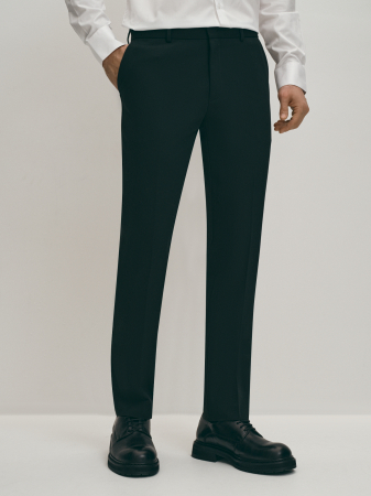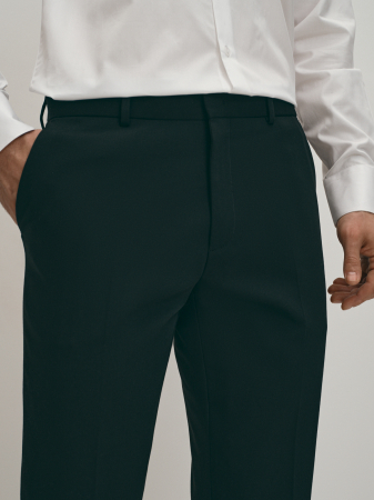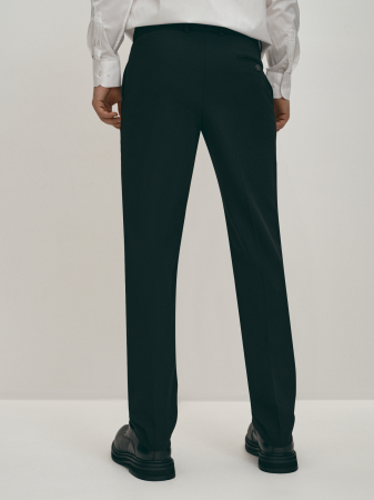 Черные прямые брюки со стрелками из смесового материала на основе натуральной шерсти и технологичного полиэстера не только отлично выглядят, но и просты в уходе, обеспечивая комфорт на протяжении всего дня и отличную теплоизоляцию. Эти брюки можно носить с классической рубашкой или поло, сочетать с пиджаком из того же материала.
