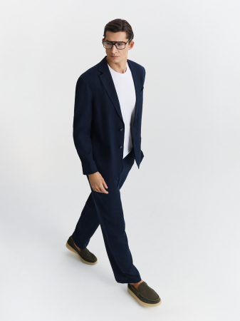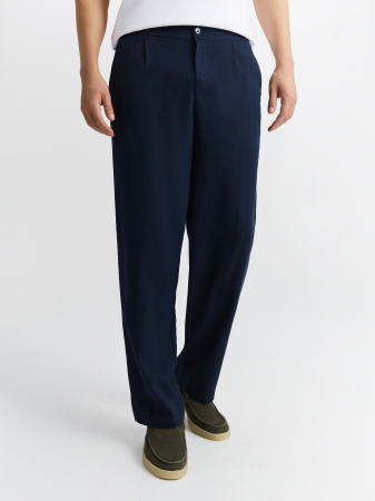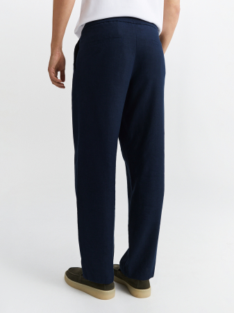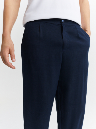 Темно-синие брюки прямого силуэта выполнены из приятной ткани с добавлением высококачественного тенсела и льна. Модель свободного кроя с маленькими защипами, комфортными боковыми карманами и поясом с регулируемым шнуром, что обеспечивает комфортную посадку для любого типа фигуры. Брюки идеально комбинируются с однобортным пиджаком из того же материала, а в сочетании с рубашкой или поло создадут комфортный летний образ для офиса.