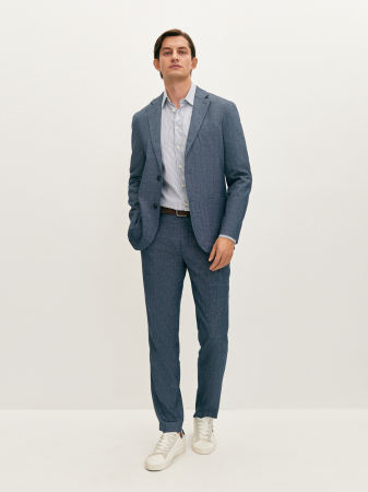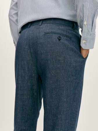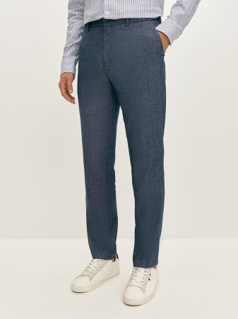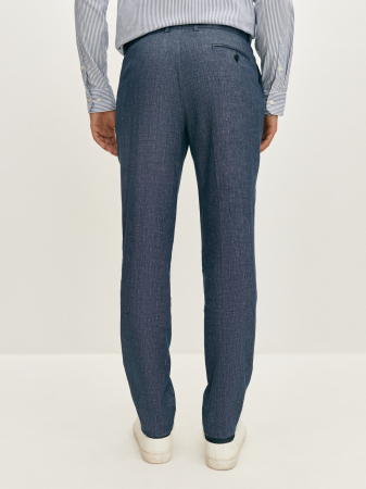 Брюки в клетку из синей меланжевой ткани полуприлегающего силуэта. Выполнены из смесовой ткани, в составе которой лен, вискоза, полиэстер и эластан. Легкий и мягкий материал отлично пропускает воздух, слегка тянется и позволяет комфортно сесть по фигуре. Модель с притачным поясом, шлёвками под ремень, боковыми наклонными карманами и застежкой на пуговицы. Для создания гармоничного однотонного образа рекомендуем сочетать с пиджаком из этой же коллекции.
