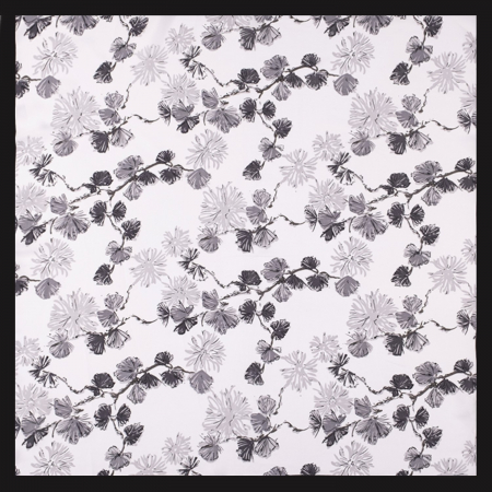 Шелковистый платок - актуальный и универсальный аксессуар. Привлекает внимание фантазийный растительный рисунок, который создаёт сложную графичную композицию, напоминающую рисунок углем.