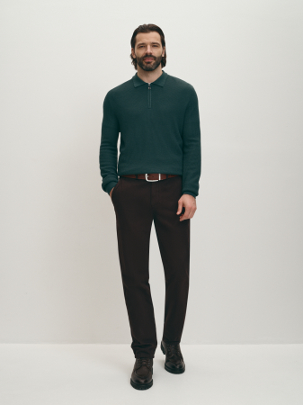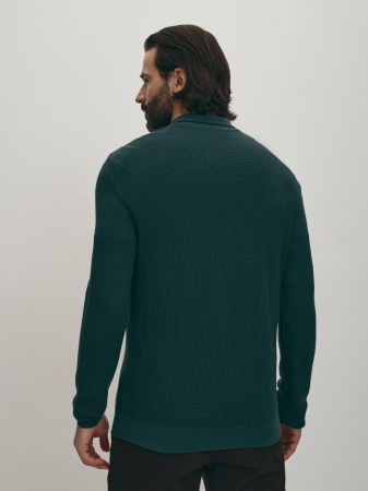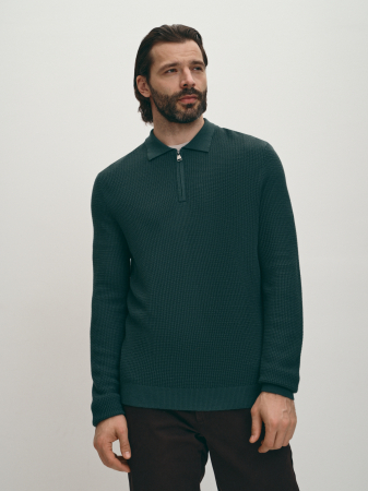 Темно-зеленое поло с удобным воротником на молнии изготовили из премиальной пряжи с нежной шерстью мериноса, переплетенной фактурным геометрическим узором. Благодаря добавлению акриловых нитей в состав материала, изделие не будет пилинговаться, сохраняя свой первоначальный вид на протяжении долгого времени. Полуприлегающий силуэт с длинным рукавом подчеркивает фигуру, не стесняя движений, такое поло станет удачным дополнением к расслабленному образу в стиле casual.