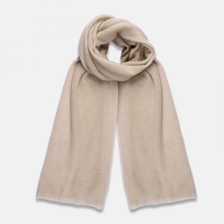 Теплый воздушный палантин - незаменимый аксессуар для холодной погоды. Лаконичное переплетение нитей прекрасно сочетается с нейтральным бежевым оттенком.