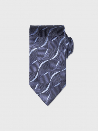 Оригинальный галстук синего цвета с абстрактным волнообразным узором. Выполнен из гладкого плотного материала с ненавязчивым матовым блеском. Благодаря эластичному заднему шву и тщательно выверенному диагональному крою, аксессуар не перекручивается и долго не теряет форму. Размер изделия 7,5*155 см