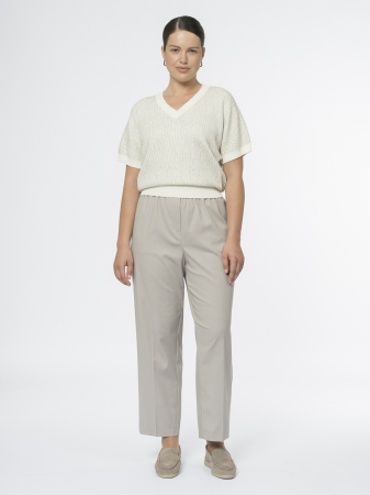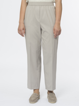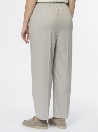 Прямой силуэт с заутюженными стрелками делает их аккуратными и элегантными. Резинка по всему поясу обеспечивает комфорт, а декоративный гульфик добавляет интересную деталь. Боковые карманы, скрытые в швах, выглядят минималистично и сохраняют чистые линии.