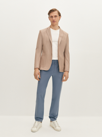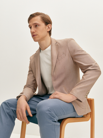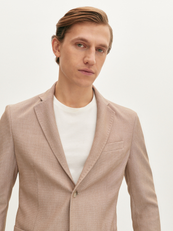 Элегантный повседневный пиджак бежевого цвета в полуприлегающем силуэте. Выполнен из эластичной смесовой ткани деликатного фактурного переплетения на основе мягкой вискозы. Изделие на частичной подкладке, что идеально подходит для весенне-летнего периода. Модель дополнена двумя накладными карманами с застежкой на две пуговицы. Бежевый пиджак в стиле casual станет элегантным решением мужского гардероба. Он прекрасно сочетается с чиносами, джинсами синего или голубого оттенка, легкой рубашкой или футболкой.
