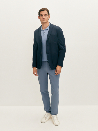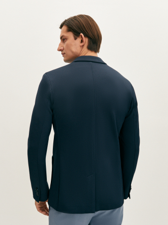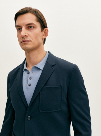 Современный трикотажный пиджак станет отличным дополнением к вашему гардеробу, не обремененному офисным дресс-кодом. Темно-синий цвет придает ему стильный и элегантный вид, а фактурный материал на основе вискозы и эластичных волокон обеспечивают комфорт и свободу движения. Модель полуприлегающего силуэта на частичной подкладке, с застежкой на две пуговицы, накладными карманами и шлицей. Пиджак в сочетании с джинсами или чиносами позволит создать современный и расслабленный образ.