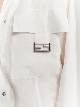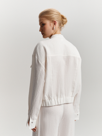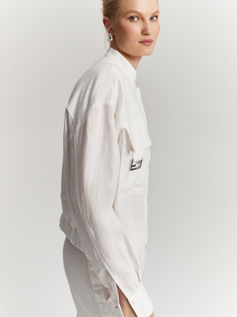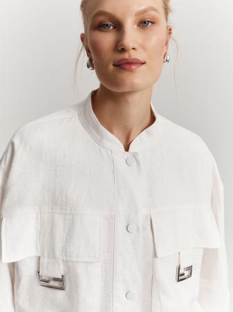Ультрамодная легкая куртка белого цвета выполнена из 100% льна, который обладает отличной терморегуляцией и сохраняет свою первоначальную форму. Однотонная модель свободного кроя с двумя накладными карманами не только удобна, но и привлекательна за счет клапанов с пряжками на лентах, имитирующих монограмму бренда. Модель в универсальном белом цвете освежит образ и станет отличным дополнением базового гардероба. Легкая куртка идеально подойдет для теплых летних прогулок, а в сочетании с белыми льняными брюками создаст расслабленный однотонный образ.