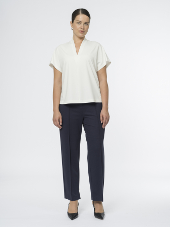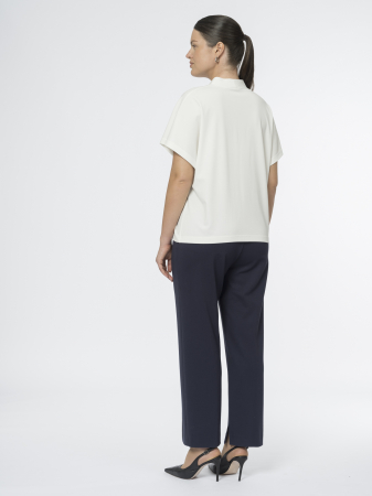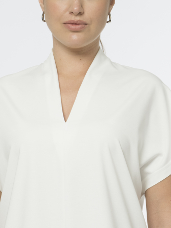 Комбинированная горловина – аккуратная стойка сзади и элегантный V-вырез спереди – подчеркивает женственность. Короткий цельнокроеный рукав сохраняет ощущение легкости, а фирменная вышивка по низу добавляет стильную деталь.