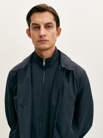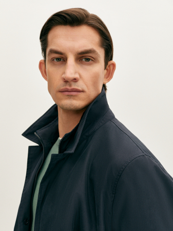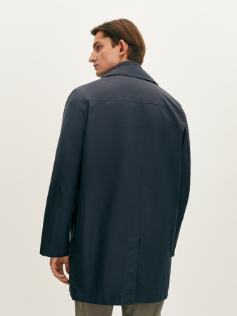 Минималистичный синий плащ прямого силуэта выполнен из прочного материала на основе хлопка и полиэстера, который прошел дополнительную водоотталкивающую обработку Water Repellent. Плащ с застежкой на потайные пуговицы, отложным воротником, прорезными карманами и шлицей. Отстегивающаяся манишка с застежкой на молнию и воротник-стойка делают модель более функциональной. Плащ органично дополнит образы как с классическими костюмами, так и образами в стиле smart casual.