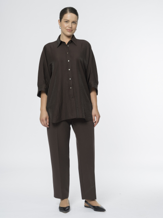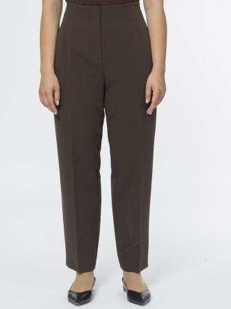 Укороченные и зауженные брюки корсетного типа – стильные, удобные и с идеальной посадкой. Сшиты из поливискозной костюмной ткани в насыщенном шоколадном оттенке, которая мягко облегает фигуру и приятна к телу.