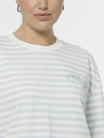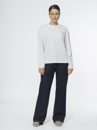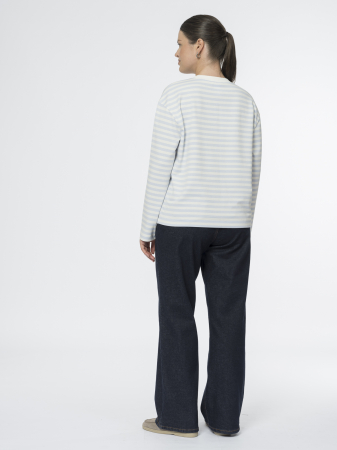 Бело-голубой лонгслив в полоску — невероятно комфортен и напоминает о французском стиле. Прямой крой, спущенное плечо и длинные рукава формируют легкий овер, а аккуратная отделка горловины трикотажем рибана добавляет модели завершённости.