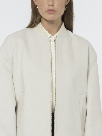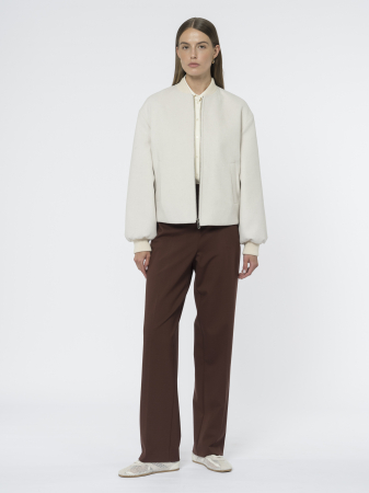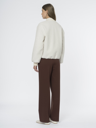 Куртка-бомбер из уютной шерстяной ткани. Свободный крой со спущенным плечом и объемными рукавами, укрепленными локтевыми вытачками, — сидит удобно и смотрится стильно. Горловина и манжеты связаны из мягкой итальянской пряжи, добавляя тепла и комфорта.