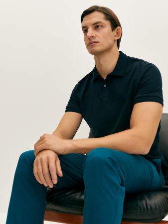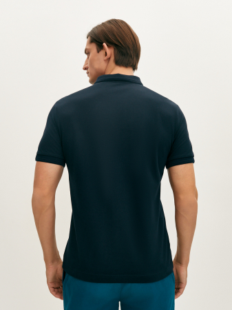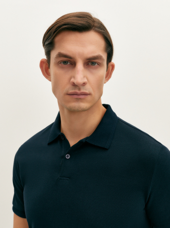 Базовое темно-синее поло прямого силуэта с коротким рукавом, отложным воротником и застежкой на две пуговицы. Манжеты и низ изделия из мягкой эластичной резинки. Модель выполнена из классического фактурного мерсеризованного хлопка, который хорошо пропускает воздух, сохраняя ощущение комфорта на весь день. Это поло станет основой вашего гардероба в сочетании с джинсами и костюмными брюками.