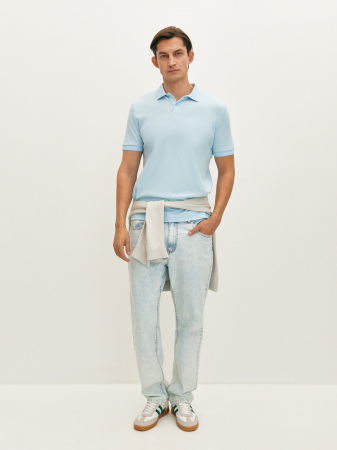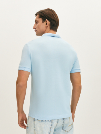 Поло светло-голубого оттенка с коротким рукавом, отложным воротником и застежкой на две пуговицы. Манжеты и низ изделия из мягкой эластичной резинки. Модель прямого силуэта выполнена из классического фактурного мерсеризованного хлопка, который хорошо пропускает воздух, сохраняя ощущение комфорта на весь день. Это поло станет базовым в вашем гардеробе в сочетании с джинсами и костюмными брюками.