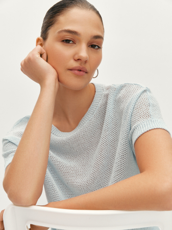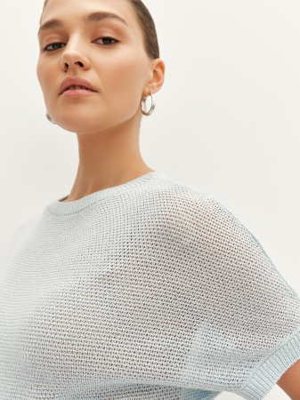 При изготовлении ажурного джемпера использовали итальянскую премиальную пряжу с деликатным блеском, которая по своим свойствам легкая, мягкая и не деформируется со временем. Прямой силуэт и короткий цельновязанный рукав обеспечивают свободу движения и комфортную посадку. Модель с эластичной резинкой по низу изделия, манжете и круглой горловине дополнит образ с джинсами и брюками.