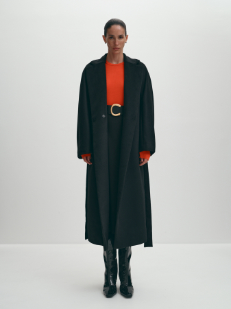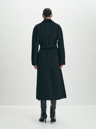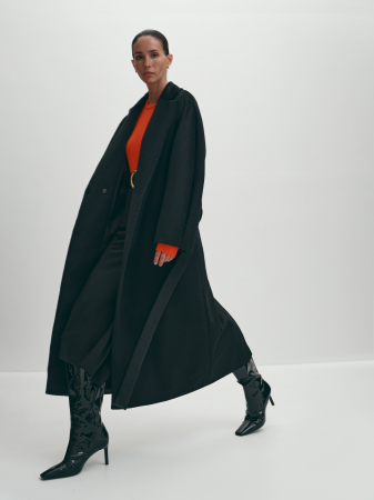 Пальто сезона Осень из овечьей шерсти на поливискозной подкладке отлично подходит для осени и мягкой зимы. Это стильная модель прямого силуэта с английским воротником и цельнокроеным рукавом. Приталенное, благодаря поясу, пальто придаёт изящество и женственность фигуре. Пальто прекрасно гармонирует с платьем и юбками разной длины, классическими брюками, джинсами. Карманы в боковых швах не перегружают образ, а высокая шлица обеспечивает комфортный шаг. Модная модель пальто-халат является базовой, уместна в деловом, casual (кэжуал) и спортивном стиле, подходит для офиса и для прогулок. Стильный черный вытягивает силуэт и универсален в сочетаниях.