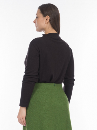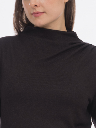 Лонгслив с цельнокроеной стойкой привлекает внимание и выгодно подчеркивает особенности фигуры за счет асимметрично заложенных по швам складок. Длинный втачной рукав комфортен для осенне-зимнего периода. Ткань блузы «дышит» благодаря вискозе и согревает посредством овечьей шерсти в составе. Асимметричная блузка больших размеров в стильном черном полуприлегающего силуэта будет востребована как повседневная, офисная, деловая, вечерняя, нарядная, а также дополнит образ в стиле спорт-шик.