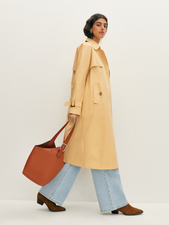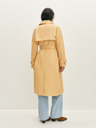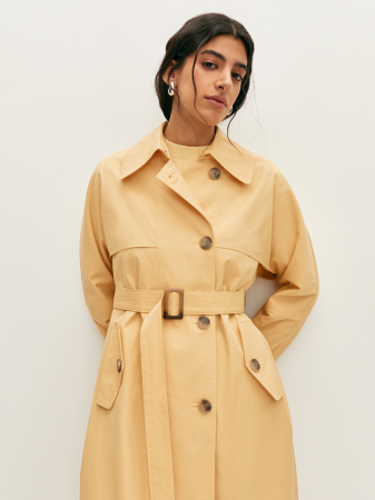 Классический тренч нежного светло-желтого оттенка с отлетными кокетками станет акцентной вещью в вашего образа. Модель прямого силуэта с широким отложным воротником и карманами с клапаном комфортно сядет по фигуре, а линию талии можно подчеркнуть элегантным регулируемым поясом. Изюминкой модели стали длинные свободные рукава с декоративными патами с пряжками. Тренч легко впишется как в классические образы с брюками, так и более расслабленный с джинсами из коллекции.