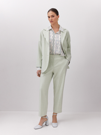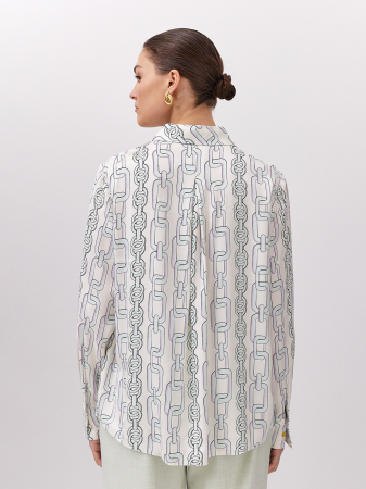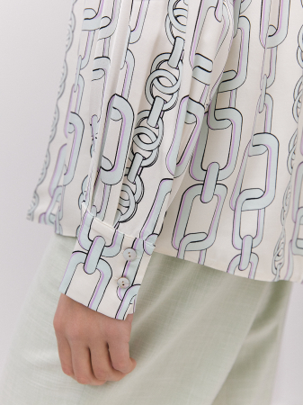 Блуза в роскошном молочно-зеленом оттенке выполнена из 100% вискозного полотна. Материал легкий, дышащий и приятен к телу. Прямой силуэт и рукава на манжетах дают чувство комфорта, а отличная посадка по фигуре скрывает недостатки и подчеркивает достоинства. Изюминкой изделия является динамичный принт «цепи» и эстетичные пуговицы из ракушки, которые придают элегантности и женственности образу. Рекомендуем комбинировать с брюками и юбкой из нашей коллекции.