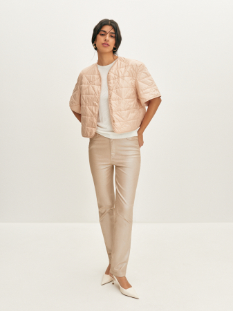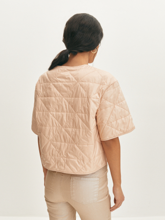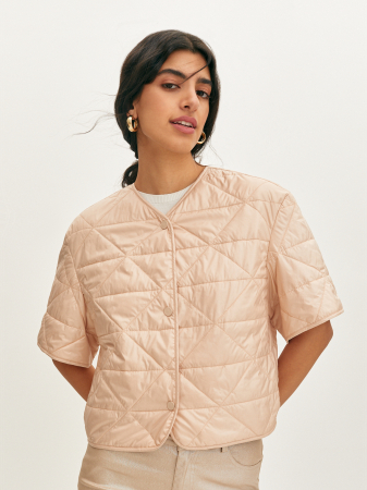 Легкая куртка в персиковом цвете с геометрической простежкой. Изделие выполнено из плащевой не продуваемой ткани. Модель прямого силуэта, укороченного фасона. Спущенная линия плеча и свободный короткий рукав обеспечивает комфортную посадку и не сковывает движения. Застежка на металлические пуговицы в тон ткани. Современную куртку можно использовать как самостоятельное изделие, так и в качестве нижнего слоя под oversize пальто.