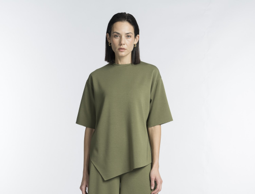 Блуза свободного кроя в благородном оливковом - незаменима для повседневной носки. Короткие рукава со спущенным плечом и круглый вырез создают актуальный силуэт, идеально ровные срезы с эффектом "необработанного края" делают модель легкой.